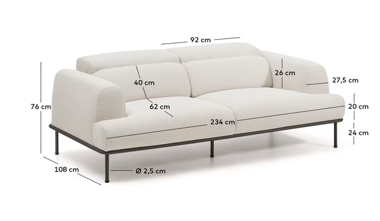 Height 76 cm Width 234 cm Depth 108 cm Product weight 0.01 Kg Seat height 44 cm Seat depth (cm) 62 cm Armrest height 26 cm Armrest width 27.5 cm Backrest height 76 cm Measurement tolerance (±cm) 2 cm