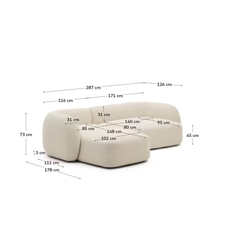 Design: Sculptural L-shape silhouette with rounded arms and integrated chaise extension