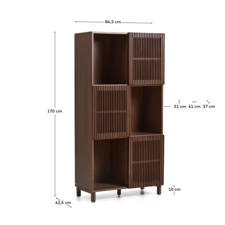 Crafted with meticulous precision, the Zalina Display Cabinet is made from high-quality engineered hardwood finished in a deep walnut veneer. The textured wooden slats give a sense of movement and depth, casting subtle shadows that shift beautifully throughout the day. Each compartment is thoughtfully designed to hold books, décor accents, or dinnerware, while the enclosed panels conceal clutter, maintaining a clean, refined aesthetic.